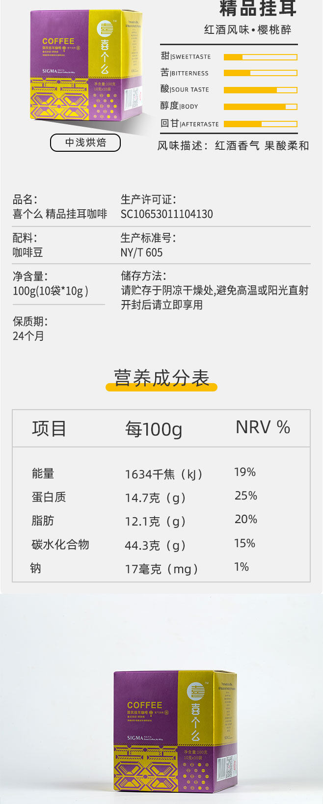 喜个么精品挂耳咖啡(红酒日晒)10g*10袋/盒