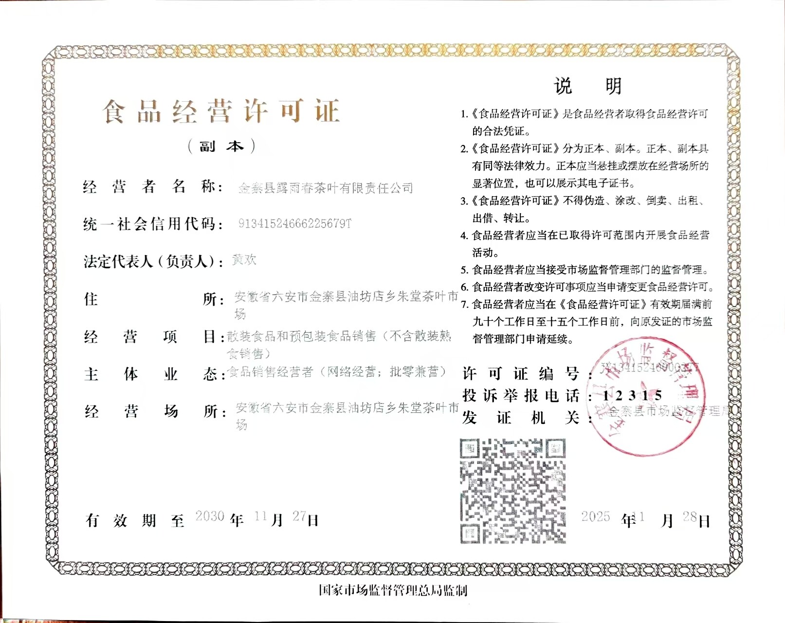 金寨县露雨春茶叶有限责任公司,成立于2007年,是集茶叶种植、加工、销售及茶文化传播为一体的产业化龙头企业。公司是安徽省农业产业化重点龙头,公司“露雨春”品牌为安徽老字号品牌,公司种植基地获评为“中国生态茶叶(食材)种植示范基地”。