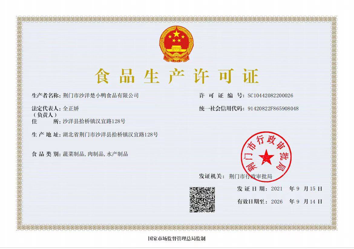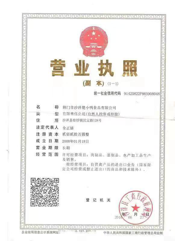 荆门市沙洋楚小鸭食品有限公司成立于2008年01月18日,注册地位于沙洋县拾桥镇汉宜路128号,法定代表人为全正娇。经营范围包括许可经营项目:肉制品、蛋制品、水产加工品生产及销售。 一般经营项目:自营禽产品的进出口业务(国家限定公司经营或禁止进出口的商品和技术除外)