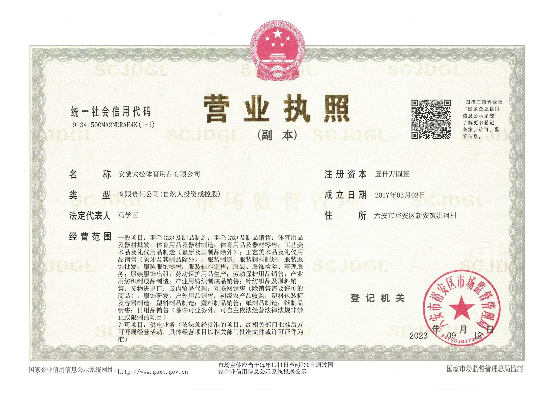 安徽大松体育用品有限公司成立于2017年03月02日,注册地位于六安市裕安区新安镇洪河村,法定代表人为冯学苗。经营范围包括一般项目:羽毛(绒)及制品制造;羽毛(绒)及制品销售;体育用品及器材批发;体育用品及器材制造;体育用品及器材零售;工艺美术品及礼仪用品制造(象牙及其制品除外);工艺美术品及礼仪用品销售(象牙及其制品除外);服装制造;服装辅料制造;服装服饰批发;服装服饰零售;服装辅料销售;服装、服饰检验、整理服务;服装服饰出租;劳动保护用品生产;劳动保护用品销售;产业用纺织制成品制造;产业用纺织制成品销售;针纺织品及原料销售;货物进出口;国内贸易代理;互联网销售(除销售需要许可的商品);服饰研发;户外用品销售;初级农产品收购;塑料包装箱及容器制造;塑料制品制造;塑料制品销售;纸制品制造;纸制品销售;日用品销售(除许可业务外,可自主依法经营法律法规非禁止或限制的项目)