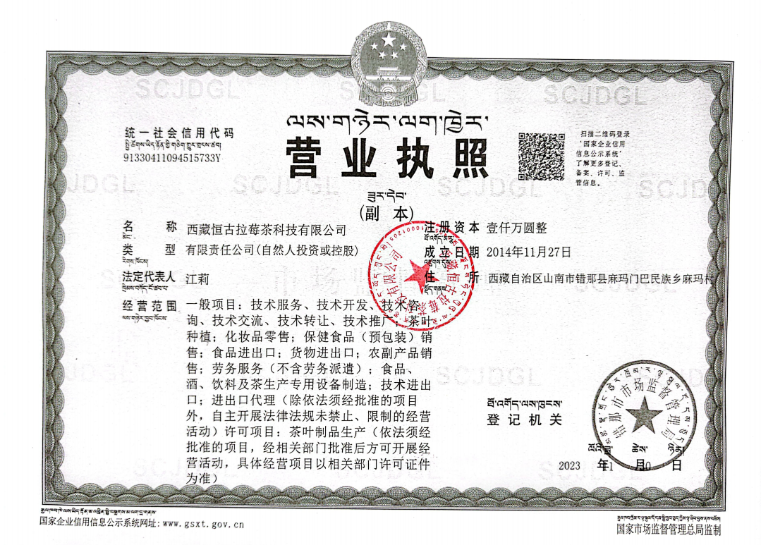西藏恒古拉莓茶科技有限公司成立于2014年11月27日,注册地位于西藏自治区山南市错那县麻玛门巴民族乡麻玛村,法定代表人为江莉。经营范围包括一般项目:技术服务、技术开发、技术咨询、技术交流、技术转让、技术推广;茶叶种植;化妆品零售;保健食品(预包装)销售;食品进出口;货物进出口;农副产品销售;劳务服务(不含劳务派遣);食品、酒、饮料及茶生产专用设备制造;技术进出口;进出口代理(除依法须经批准的项目外,自主开展法律法规未禁止、限制的经营活动)许可项目:茶叶制品生产(依法须经批准的项目,经相关部门批准后方可开展经营活动,具体经营项目以相关部门许可证件为准)