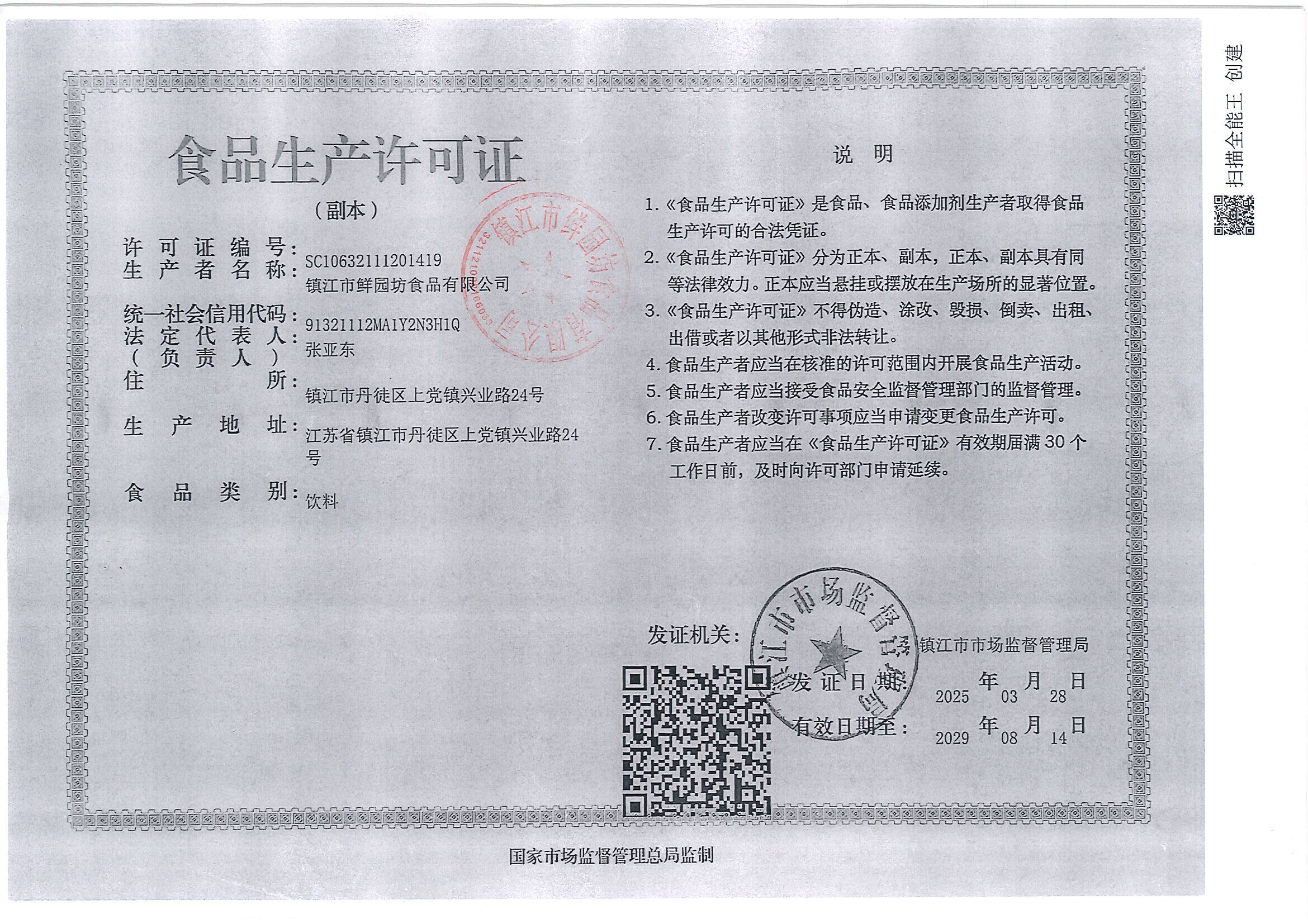镇江市鲜园坊食品有限公司(曾用名:镇江市祝枝山食品饮料有限公司),成立于2019年,位于江苏省镇江市,是一家以从事食品制造和销售的企业。主要生产产品:<<茶饮料>>,<<含乳饮料>>,<<植物蛋白饮料椰子汁>>,<<谷物类饮料>>,<<味饮料>>,<<果蔬汁类及其饮料>>