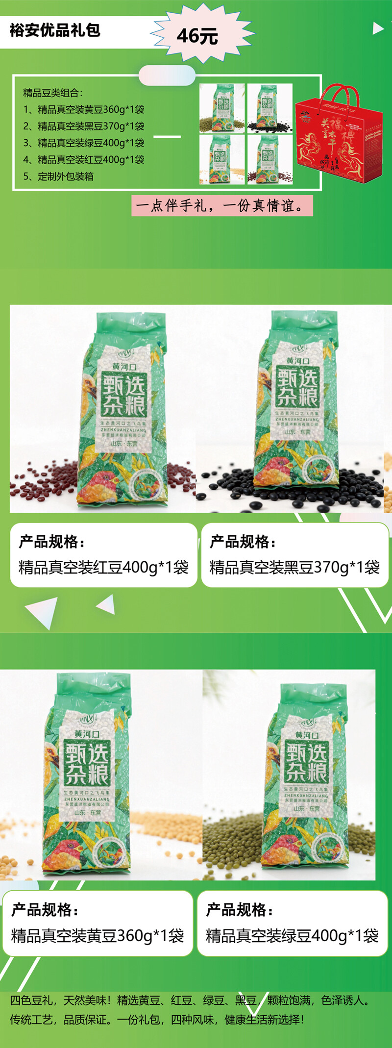 1、精品真空装黄豆360g*1袋 2、精品真空装黑豆370g*1袋 3、精品真空装绿豆400g*1袋 4、精品真空装红豆400g*1袋