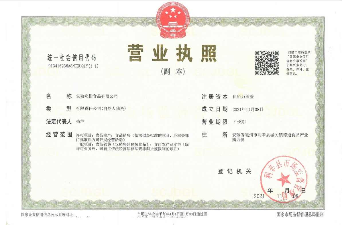安徽吮指食品有限公司位于毫州市利辛县工业园区,是一家食品生产销售实体企业,拥有25名员工和5000平方米的厂房,主要生产各种风味的卤鸡蛋、卤鹤鹑蛋、卤牛肉等产品,公司现有卤牛肉、卤鸡蛋、卤鹌鹑蛋、卤鸡爪等食品生产线3条,食品加工进行全封闭无尘车间生产,生产产品种类多、口味齐全,公司采取线上和线下同时销售模式,市场销售量不断提高,深受广大用户的喜爱,年销售额500万元以上。